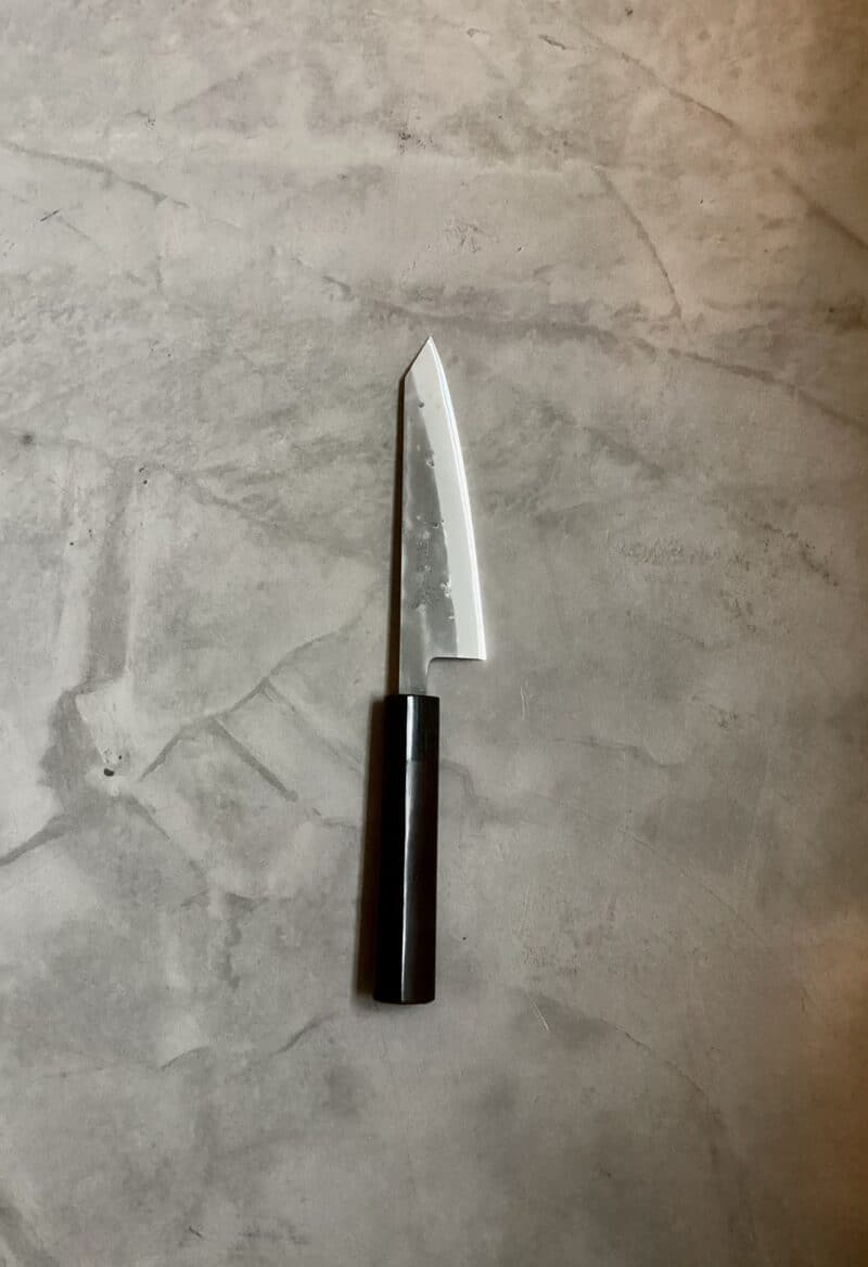 • Kerne: Aogami 2 (Blue Paper Steel), hærdet til HRC 62–63 for langvarig skarphed.