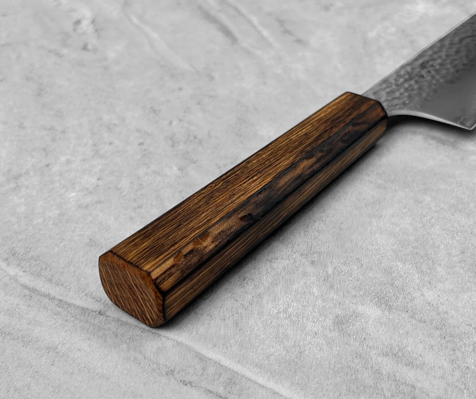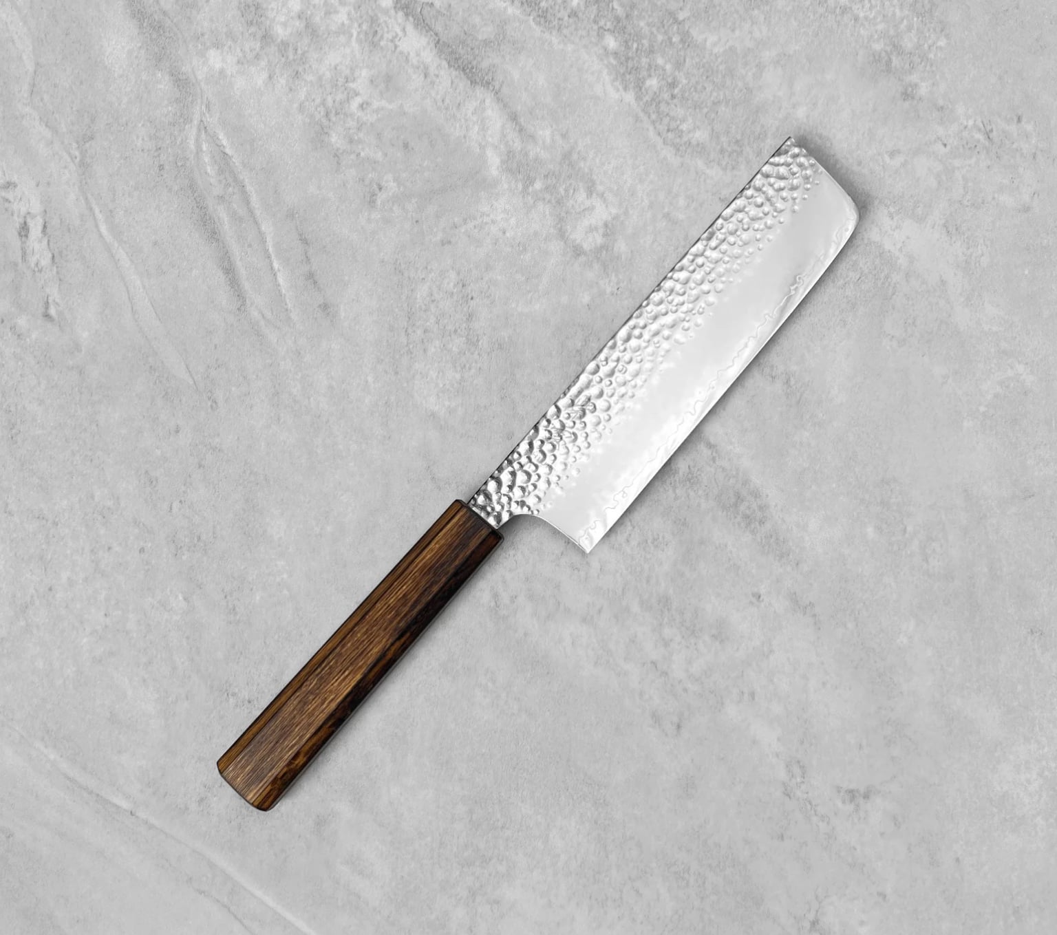 Håndtaget er lavet af egetræ og er ottekantet, hvilket gør det nemt at gribe fat i. Bladet har et hamret mønster, der afspejler traditionelle knivsmedeteknikker, og har en høj bladseparationseffekt, så du kan nyde både udseende og funktionalitet.