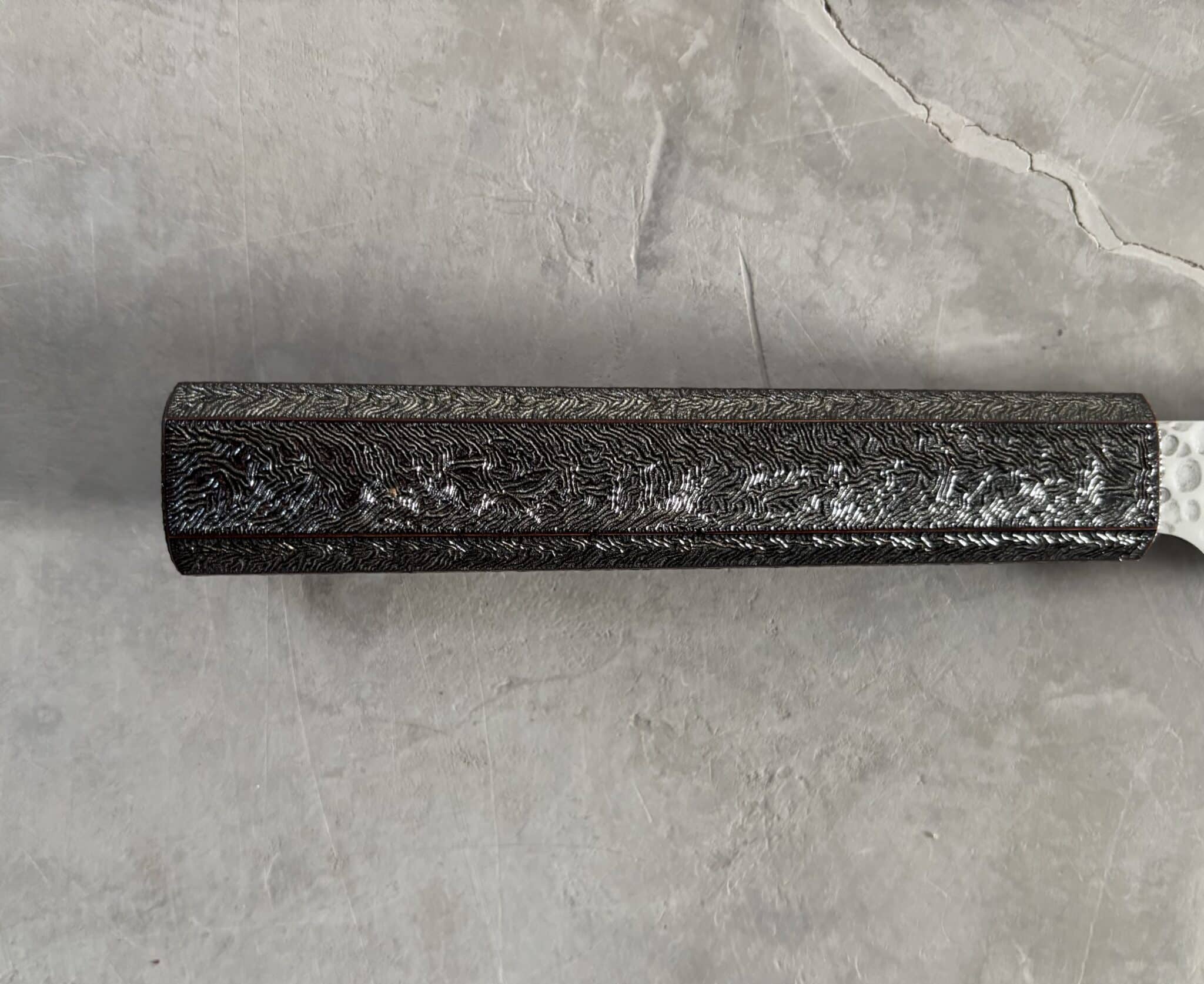 Håndtaget er lavet af egetræ og er ottekantet, hvilket gør det nemt at gribe fat i. Bladet har et hamret mønster, der afspejler traditionelle knivsmedeteknikker, og har en høj bladseparationseffekt, så du kan nyde både udseende og funktionalitet.