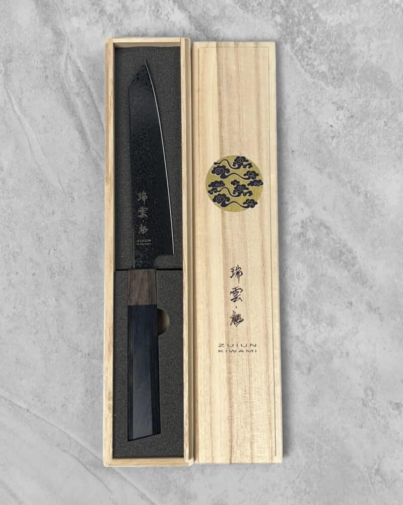 Zuiun Kiwami er toppen af japansk knivkunst. Den bygger på 100 års tradition – men er skabt til kokke og entusiaster, der kun vil arbejde med det allerbedste. Den dybsorte, spejlblanke klinge og det unikke damaskmønster gør kniven til et stykke funktionelt kunsthåndværk.