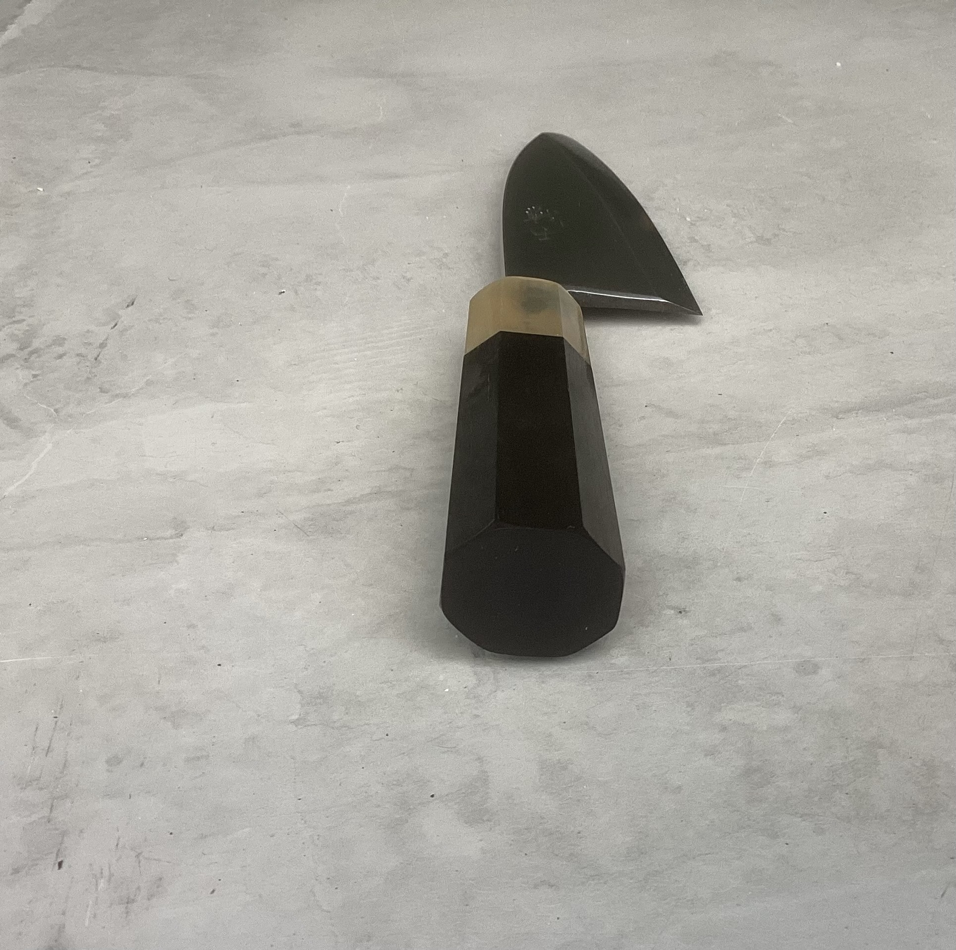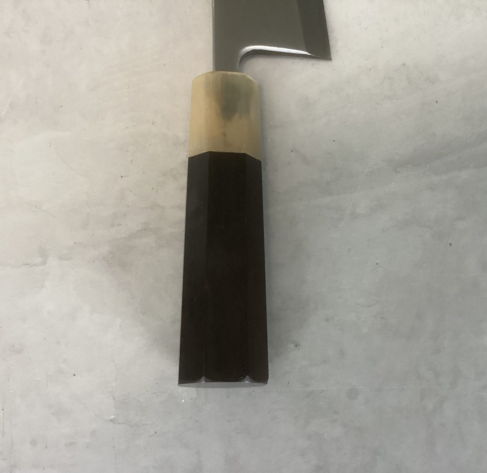 Kniven er udstyret med et eksklusivt wa-håndtag i ibenholt, afsluttet med lyst bøffelhorn, som ikke blot understreger knivens æstetik, men også sikrer optimal balance og stabilitet under krævende arbejde. Materialerne er nøje udvalgt for deres holdbarhed, ergonomi og tidløse elegance.