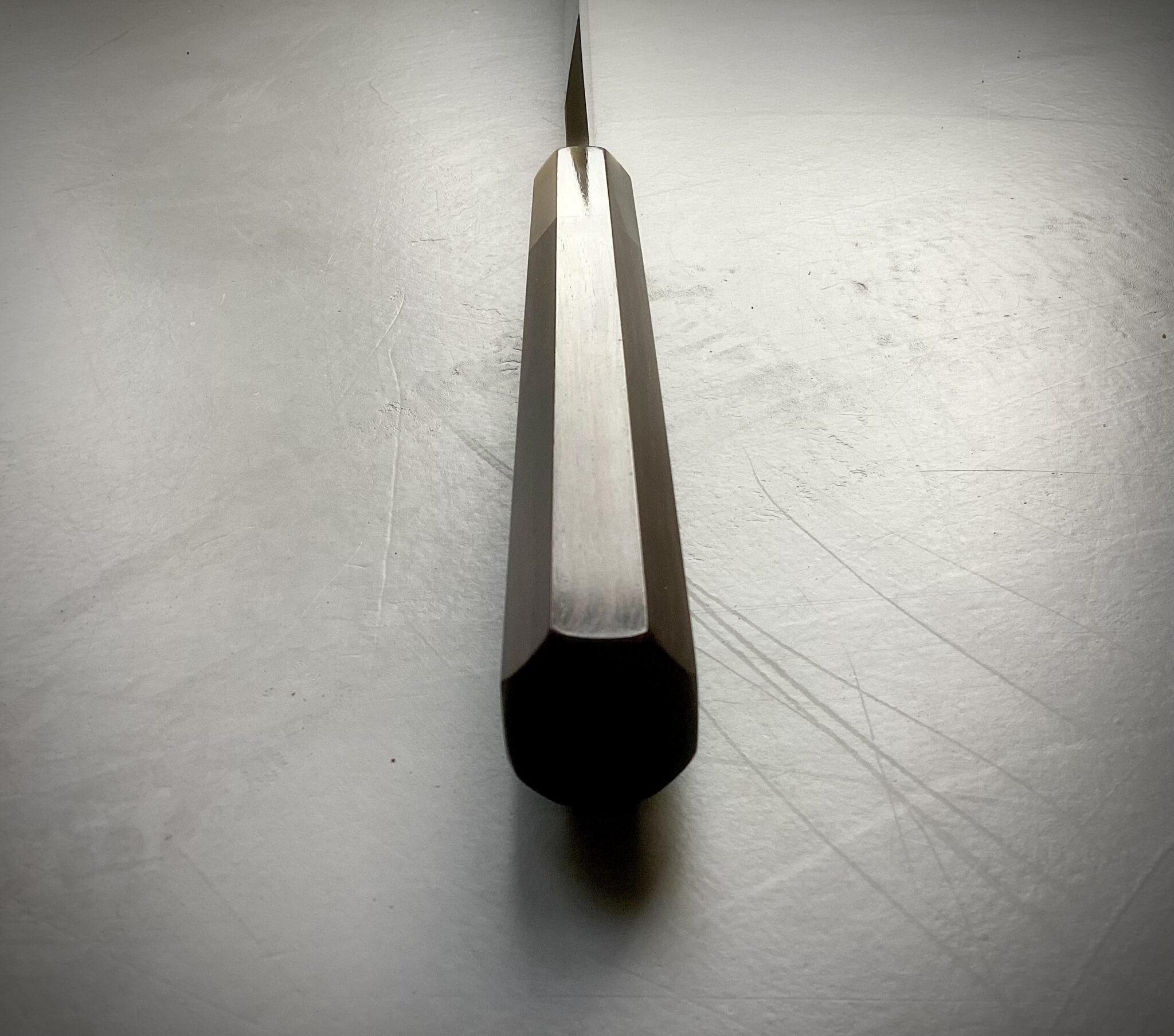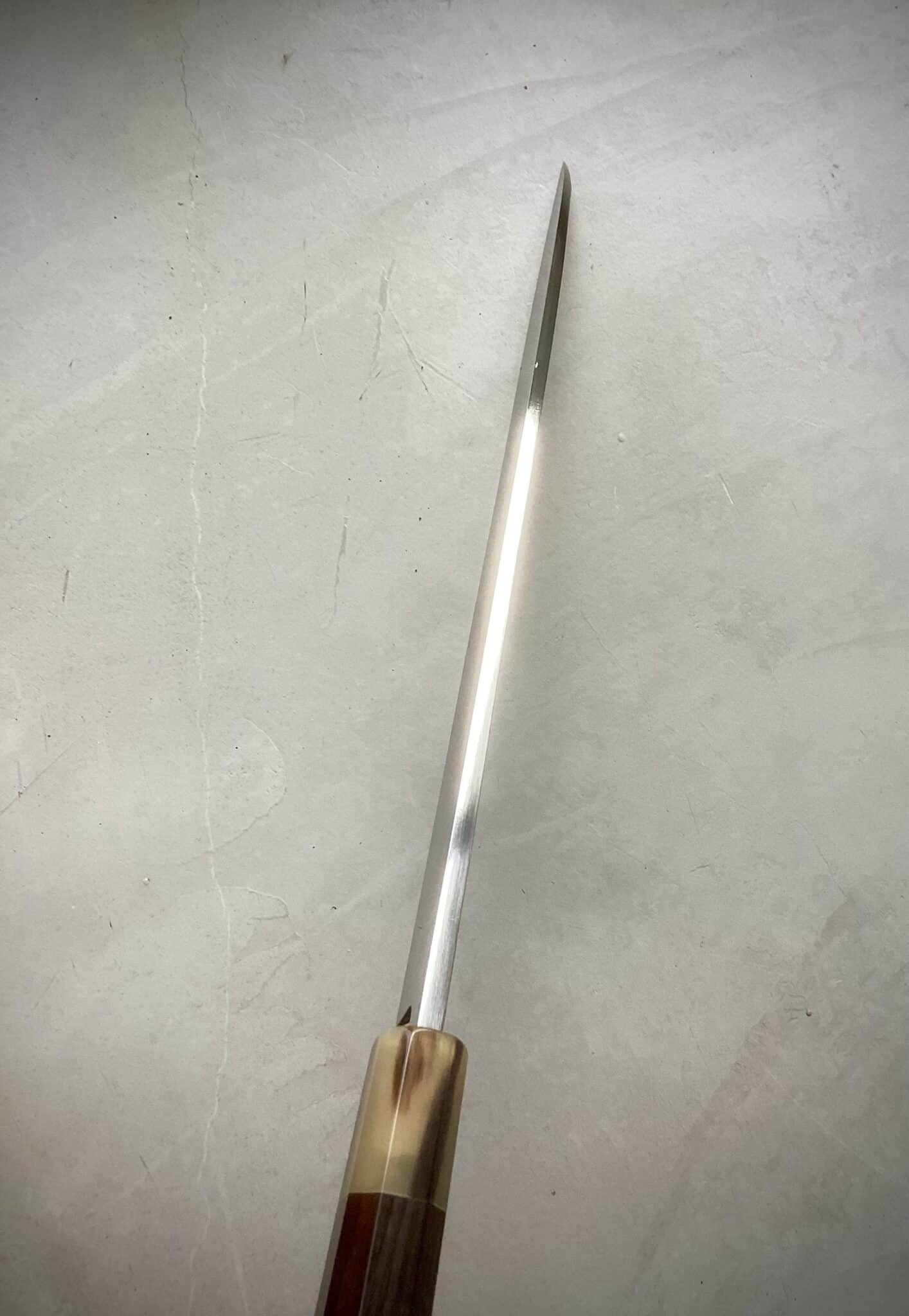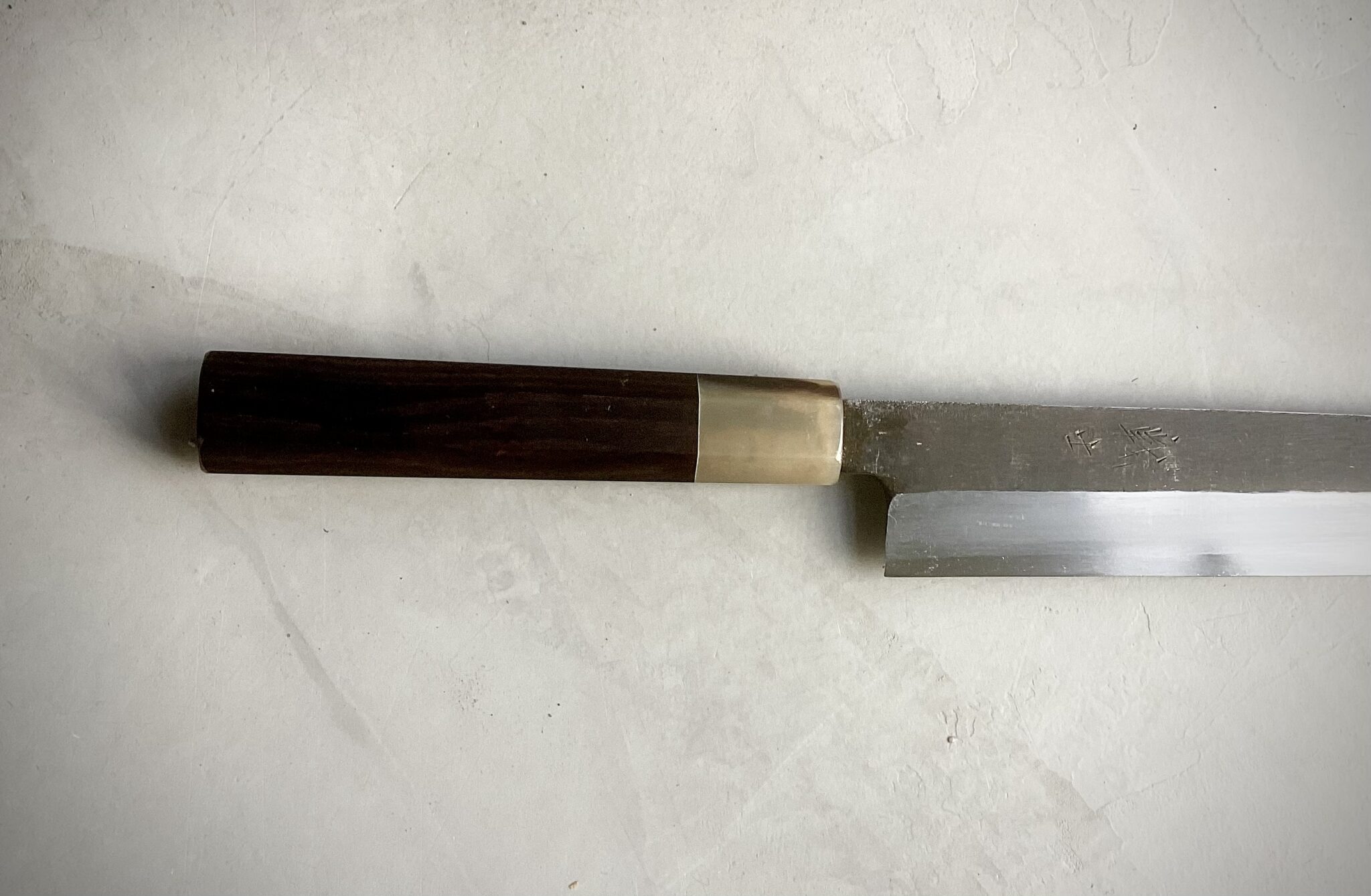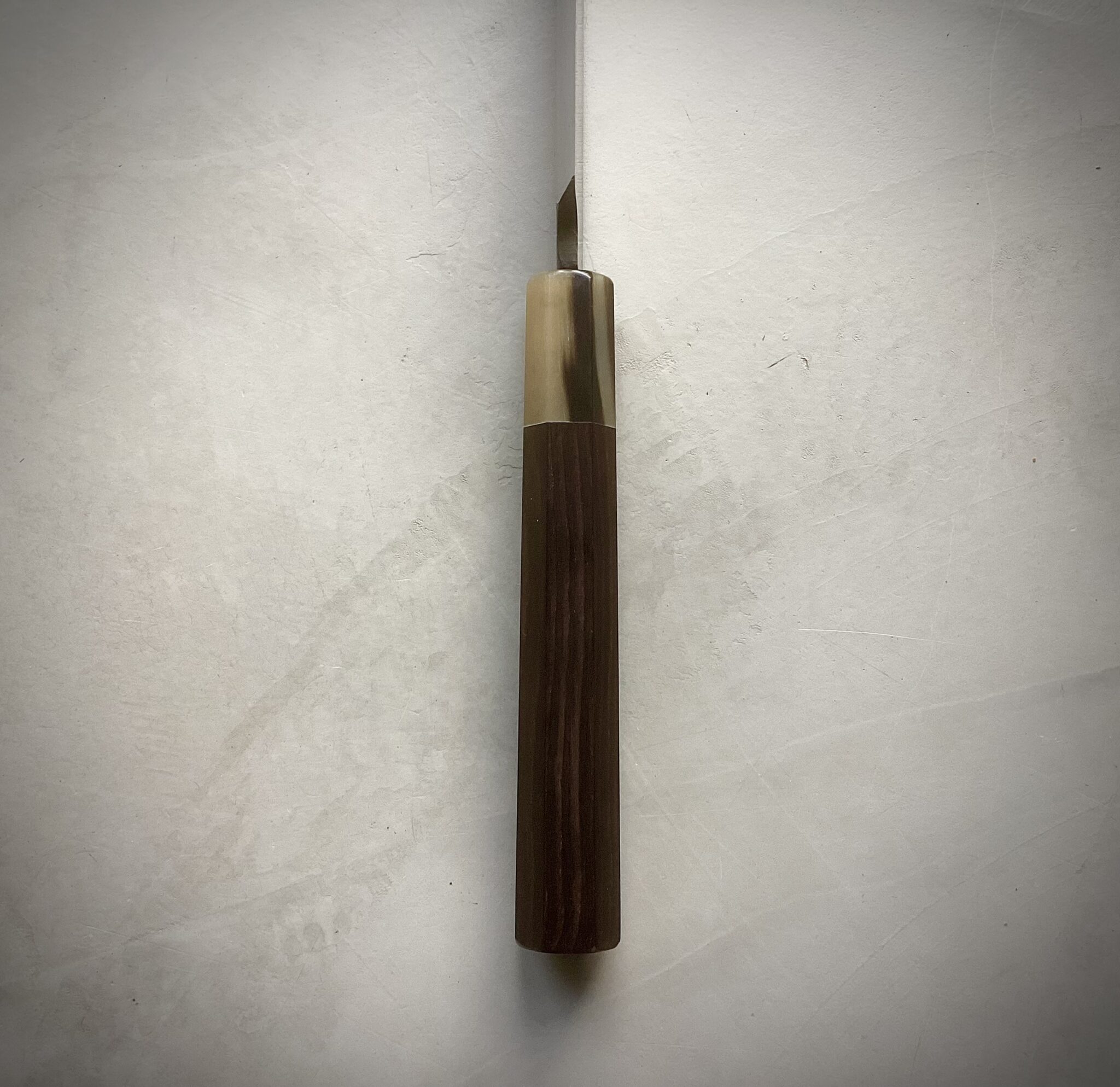 Kniven er monteret med et eksklusivt japansk wa-håndtag i ibenholt, afsluttet med lyst bøffelhorn. Den oktagonale form sikrer fremragende ergonomi og kontrol, mens den traditionelle indbrændte montering garanterer stabilitet, perfekt balance og lang levetid.