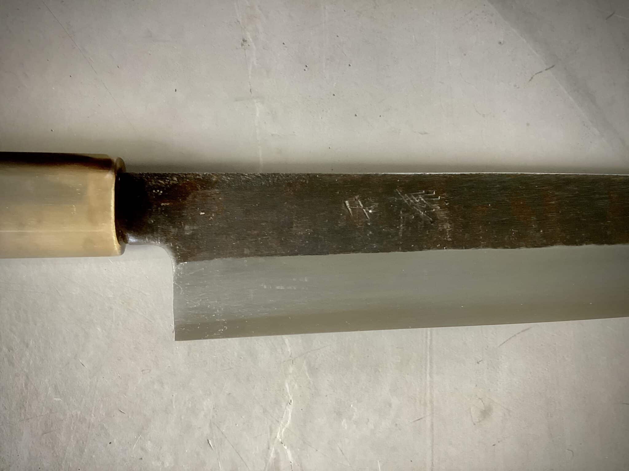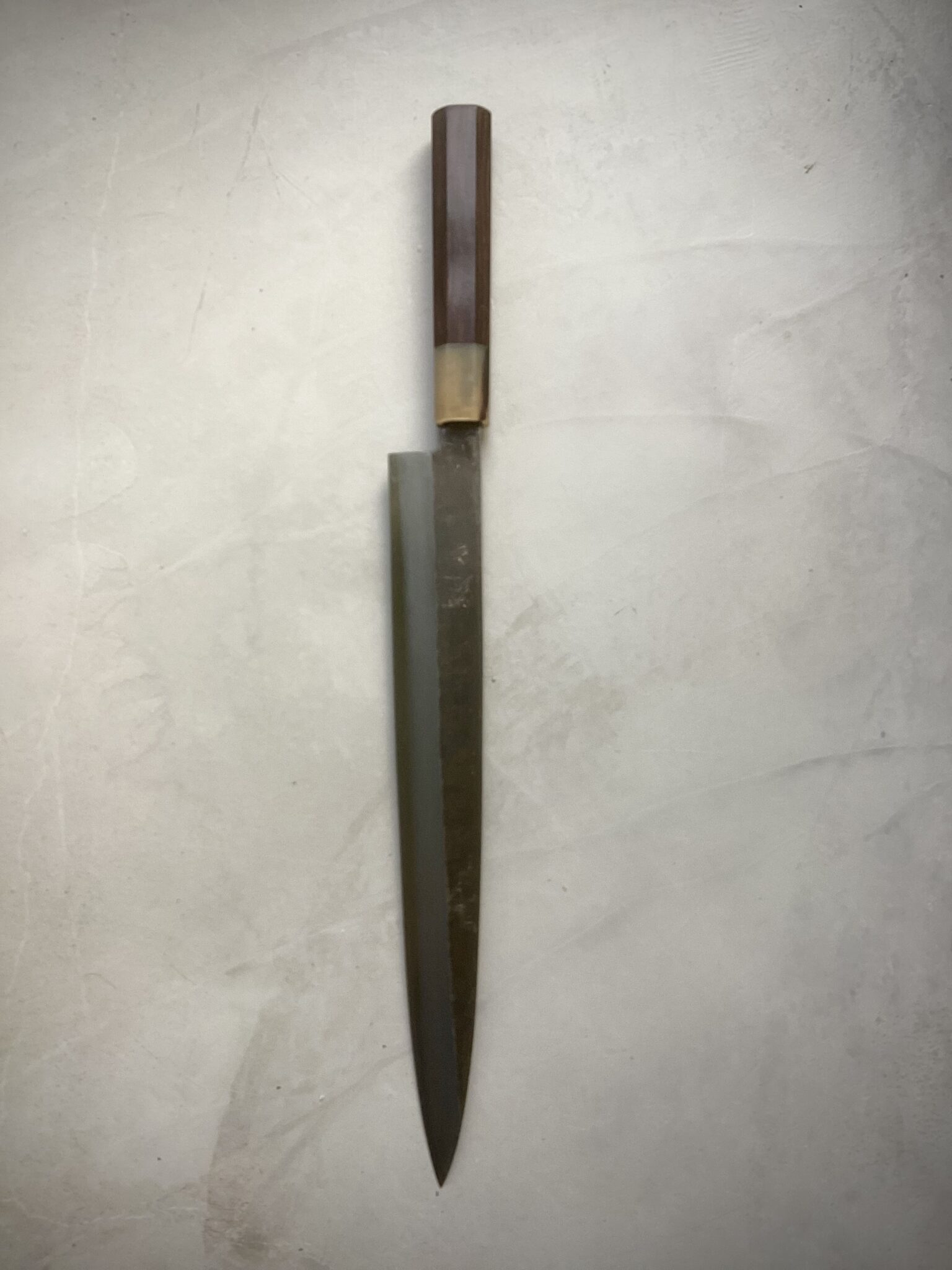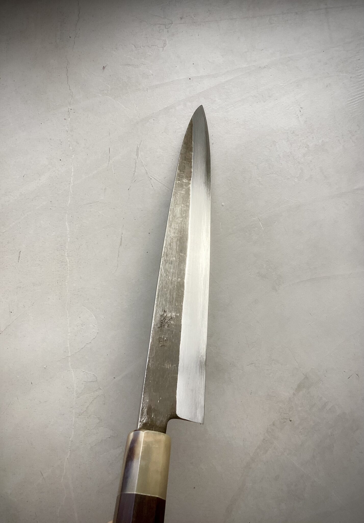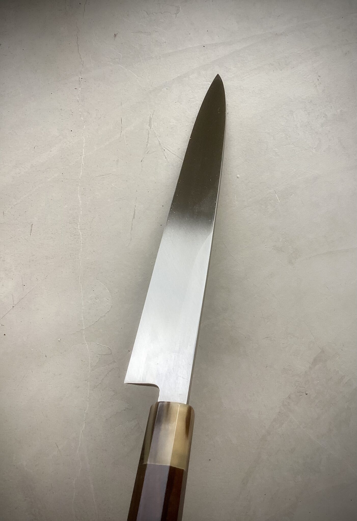 Kniven er monteret med et eksklusivt japansk wa-håndtag i ibenholt, afsluttet med lyst bøffelhorn. Den oktagonale form sikrer fremragende ergonomi og kontrol, mens den traditionelle indbrændte montering garanterer stabilitet, perfekt balance og lang levetid.